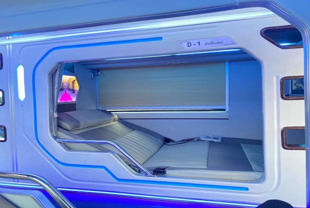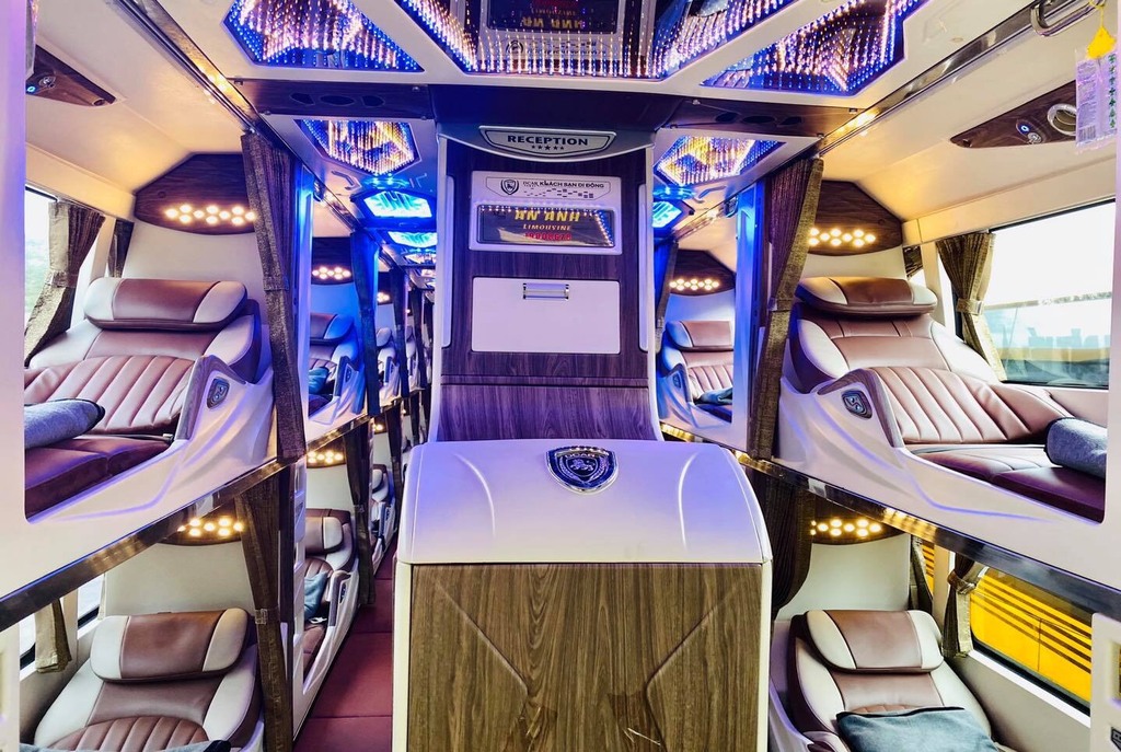 - Xe 22 Cabin đôi VIP: chia thành 2 tầng, tầng 1 có 10 Cabin đôi và tầng 2 có 10 Cabin đơn. Được thiết kế theo phong cách hoàng gia và được trang bị các thiết bị hiện đại: tivi màn hình LCD, sạc USB, wifi tốc độ cao, hệ thống giường massage, hệ thống giường nâng hạ có thể điều chỉnh được. Khi lên xe, hành khách sẽ được cung cấp nước uống, khăn lạnh, đồ ăn nhẹ.